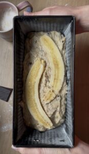 • Przełóż ciasto do przygotowanej wcześniej formy. Dodatkowego banana przekrój wzdłuż i połóż na wierzch chlebka.