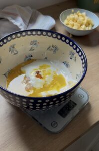 - W jednej misce połącz zakwas z jajkami, roztopionym masłem, jogurtem, cukrem i wanilią.