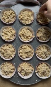 - Nałóż ciasto do papilotek (12 sztuk, ok. 90% wysokości) i obficie posyp kruszonką.